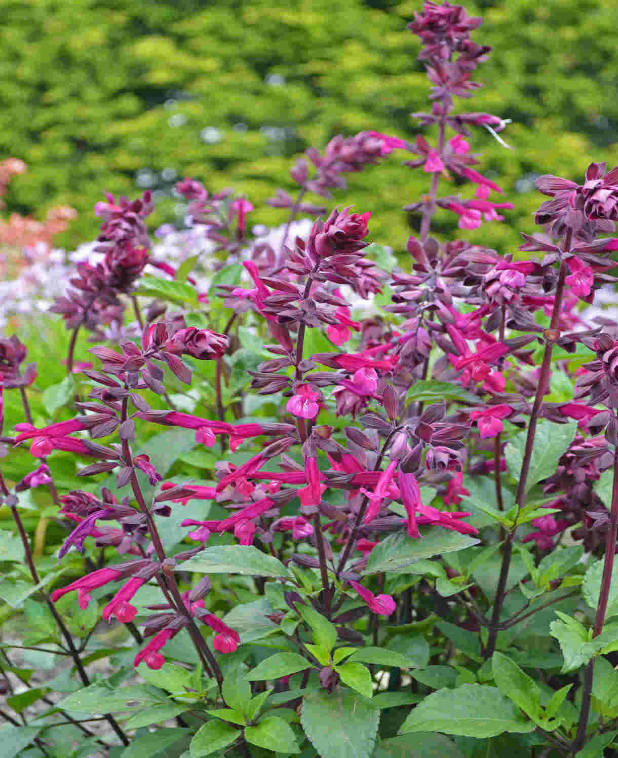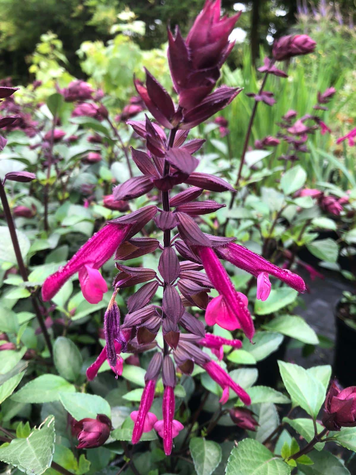 Diese Salvia ist ein Halbstrauch mit langen, tiefvioletten Stängeln, granatroten Blüten und weinroten Hüllblättern. Die Blätter sind dunkelgrün und aromatisch.